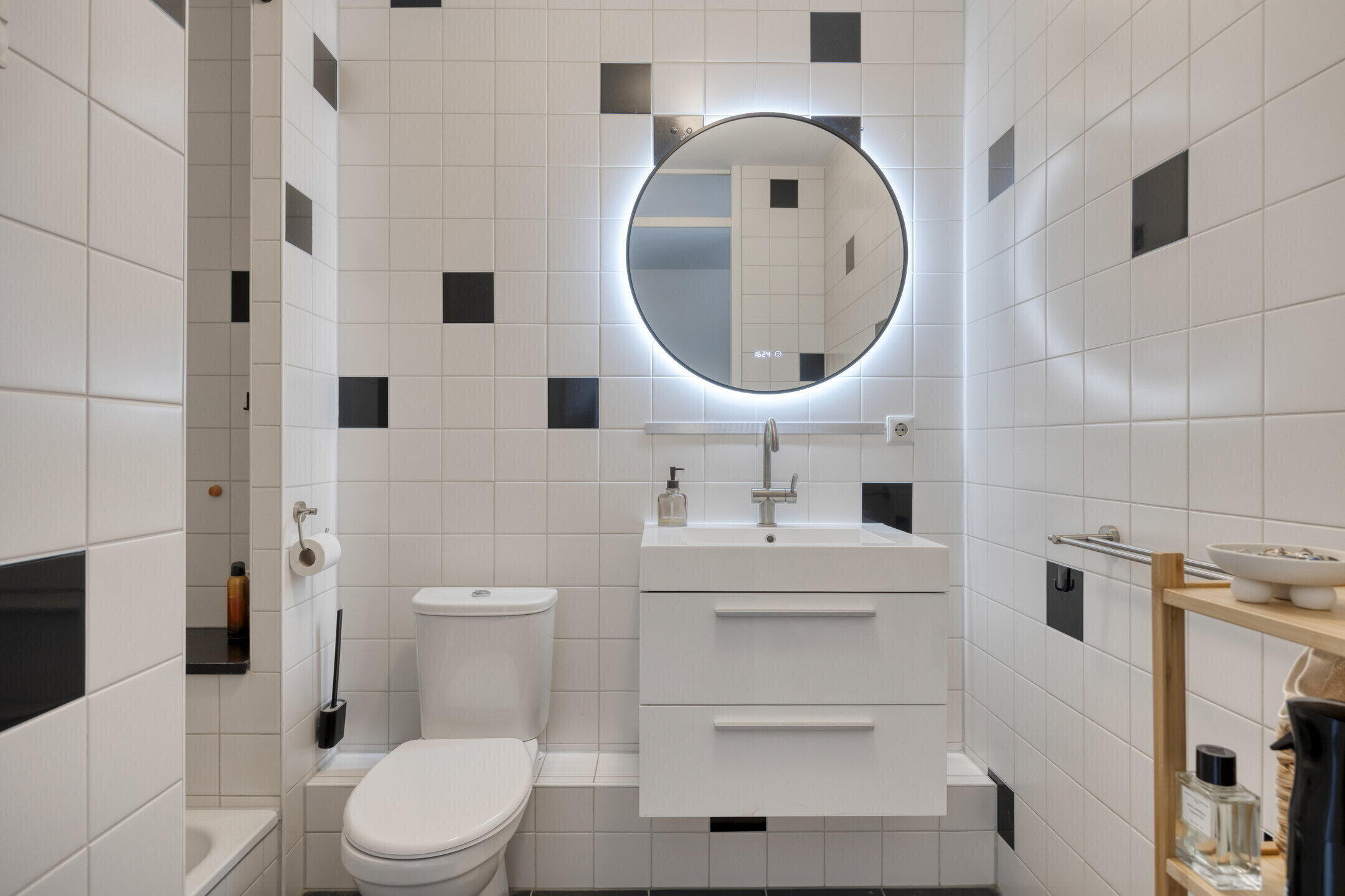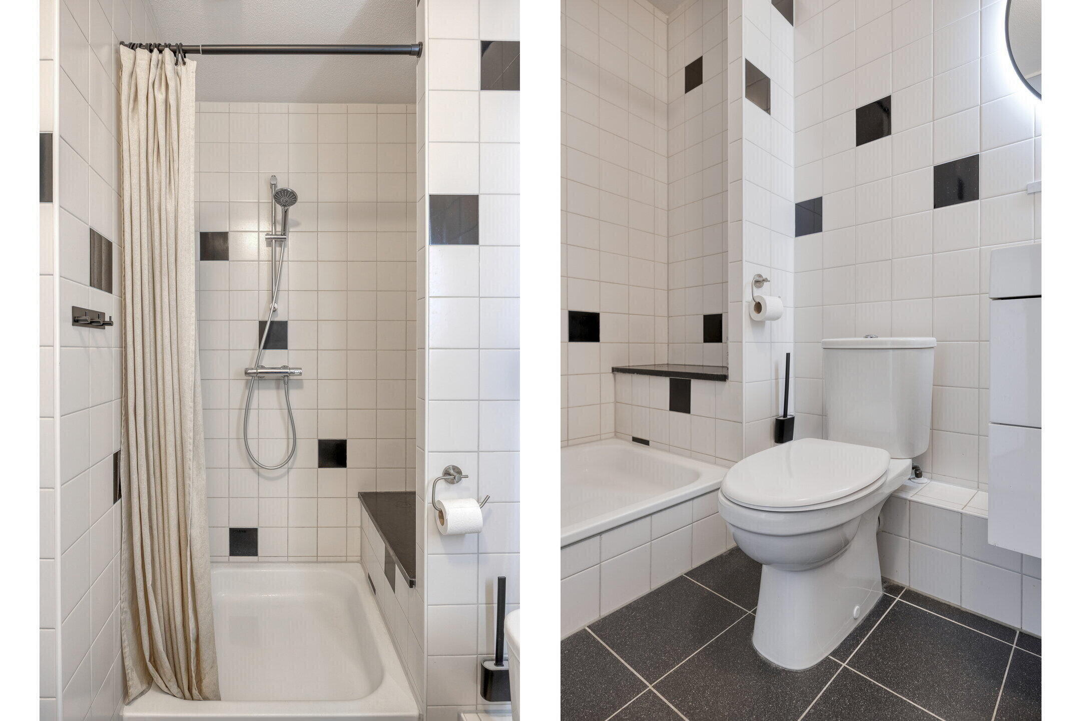 De badkamer (ca. 2.72 x 1.21 m) is volledig betegeld en beschikt over een douchecabine met thermostaatkraan, regendouche en separate handdouche. De douche is tevens voorzien van een praktisch betegeld nisje voor het plaatsen van doucheproducten. Verder beschikt de badkamer over een vaste wastafel en een zwevend toilet.