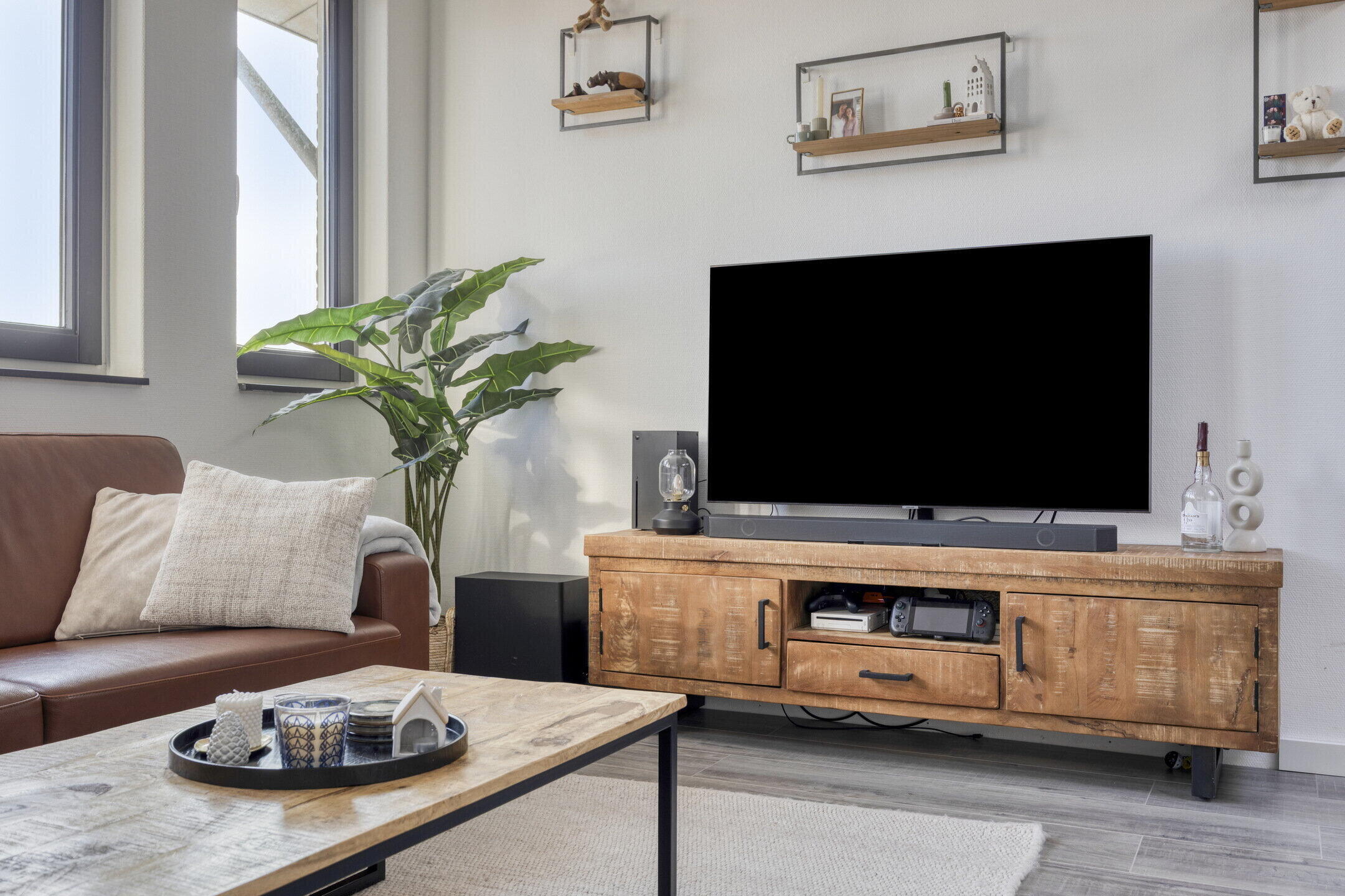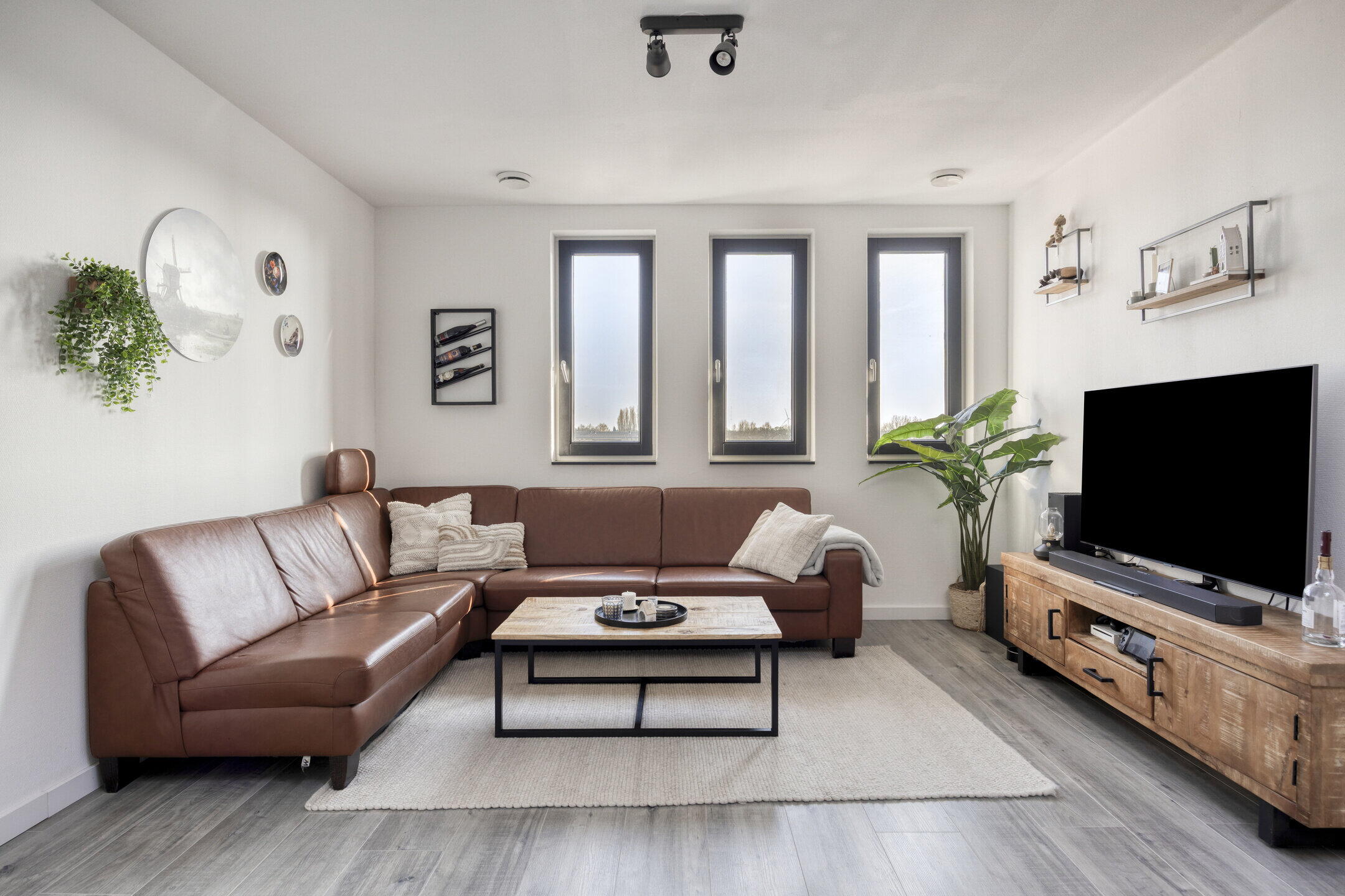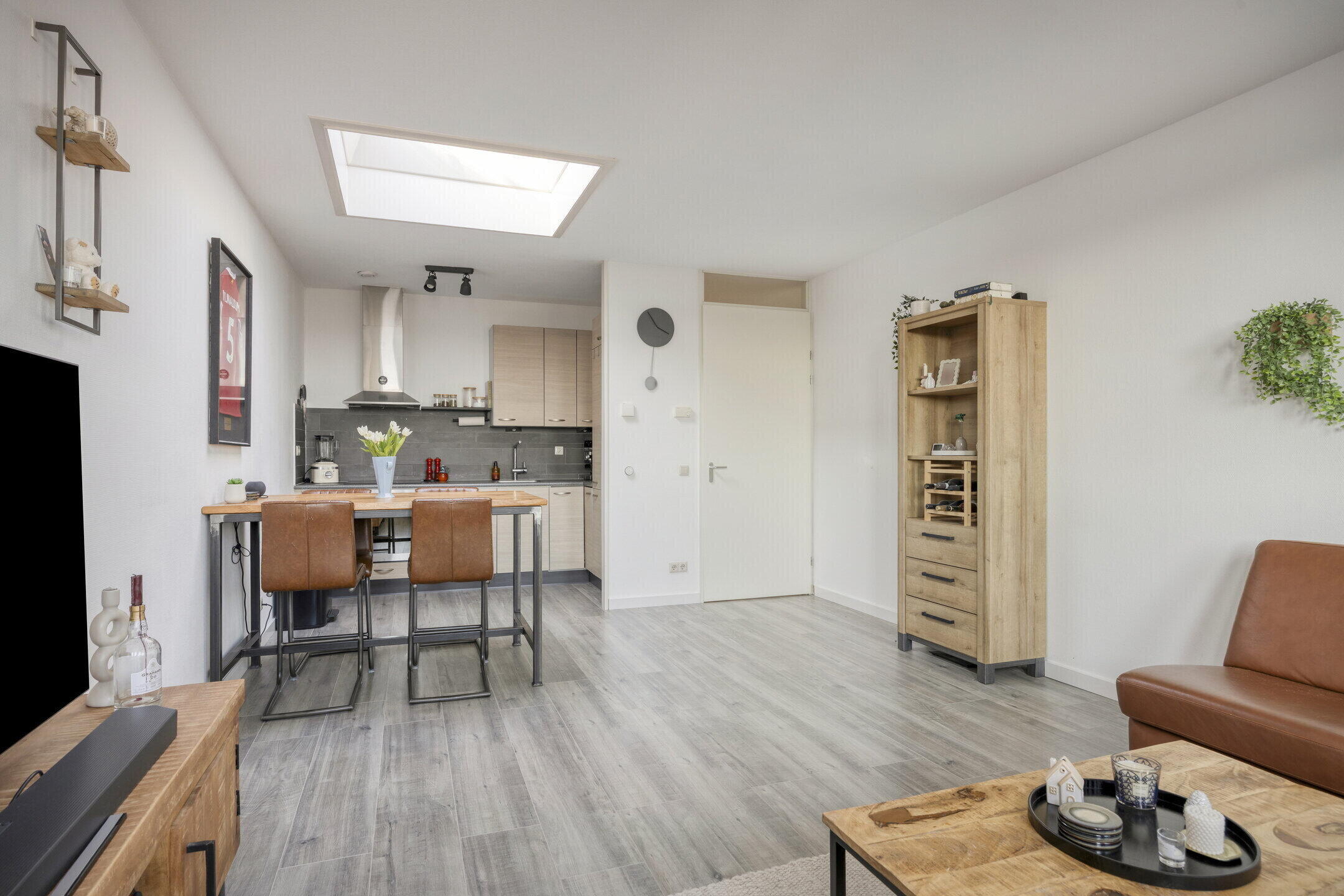 De woonkamer (ca. 5.81 x 3.99 m) is ruim van opzet en staat in open verbinding met de open keuken. Dankzij de grote raampartijen en het aanwezige dakraam is de woonkamer bijzonder licht.
