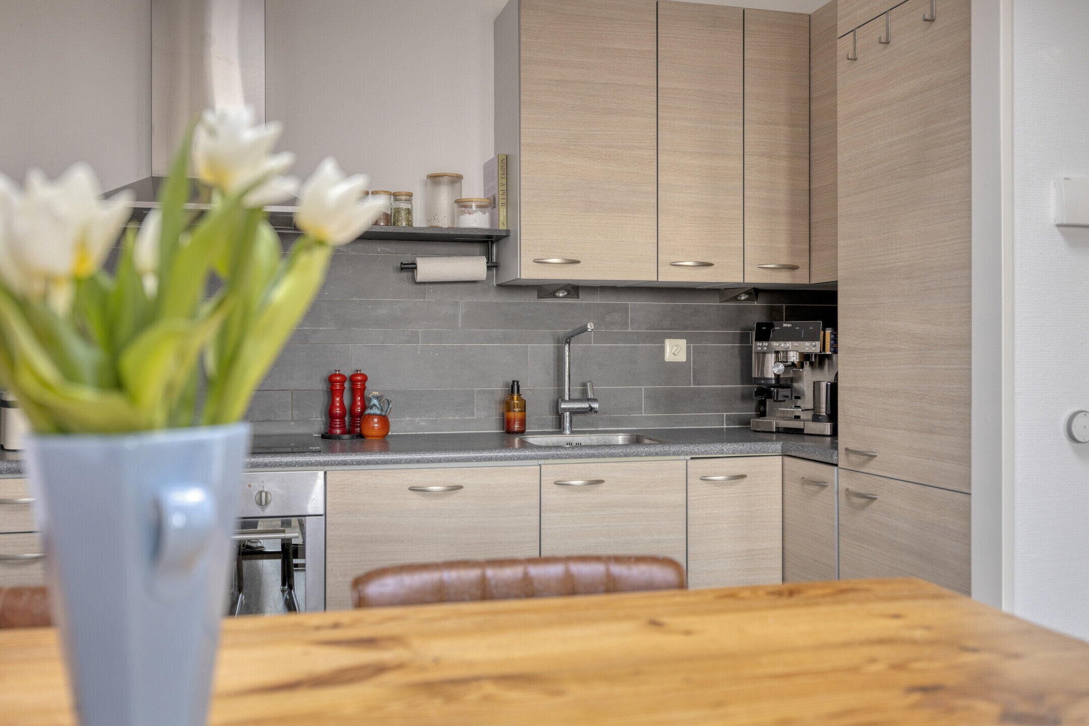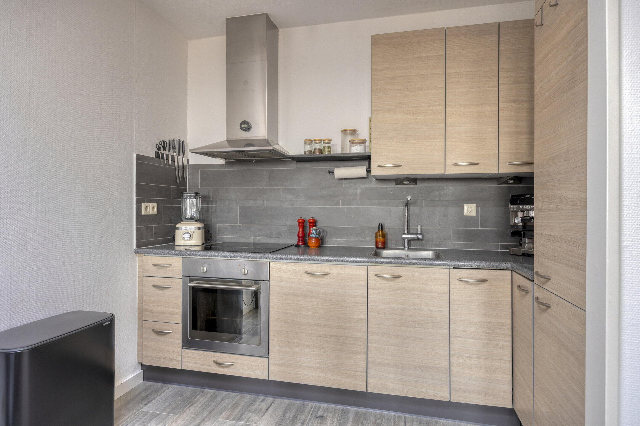 De keuken (ca. 2.85 x 1.56 m) is uitgevoerd in hoekopstelling en voorzien van een 4-pits keramische kookplaat, afzuigkap, vaatwasser, koelkast, 3-laden vriezer, RVS-spoelbak en diverse onder- en bovenkasten.